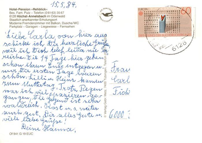 73896965 alte Postkarte Annelsbach Hoechst Odenwald Hotel Pension Rehblick Gastraeume Liegewiese postalisch gelaufen Erhaltung siehe scans [FriedD77] KatCode: 11110006437009