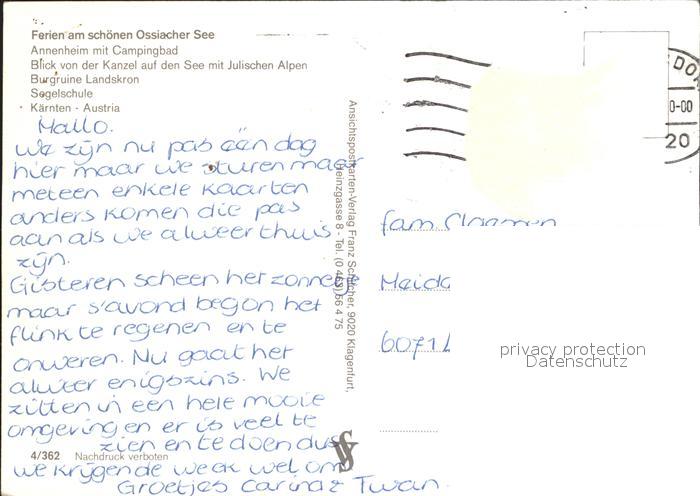 72230431 alte Postkarte Annenheim Ossiacher See Blick von der Kanzel Burgruine Landskron Segelschule postalisch gelaufen Erhaltung siehe scans KatCode: 11390