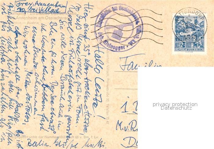 73304329 alte Postkarte Annenheim Ossiacher See Campingplatz Strandbad Fliegeraufnahme postalisch gelaufen Erhaltung siehe scans [FriedD77] KatCode: 11390