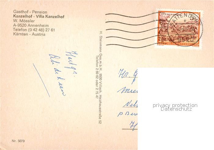 73157196 alte Postkarte Annenheim Ossiacher See Gasthof Pension Kanzelhof Villa Kanzelhof Bildstock Fliegeraufnahme postalisch gelaufen Erhaltung siehe scans [FriedD77] KatCode: 11390