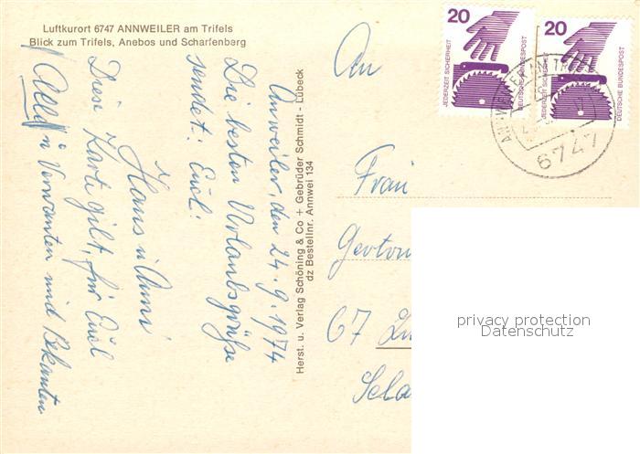 73606778 alte Postkarte Annweiler Trifels Fliegeraufnahme mit Trifels Anebos und Scharfenberg postalisch gelaufen Erhaltung siehe scans [LiesaD40] KatCode: 11110007337501