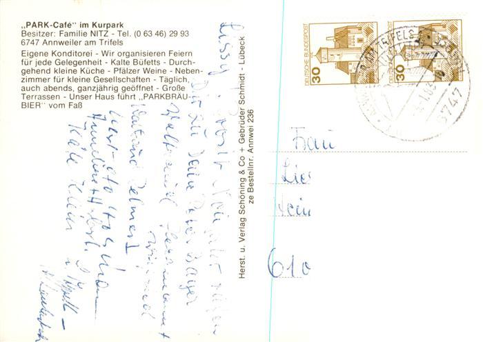 73895629 alte Postkarte Annweiler Trifels Park-Cafe Parkanlagen Teich Panorama postalisch gelaufen Erhaltung siehe scans [FriedD77] KatCode: 11110007337501