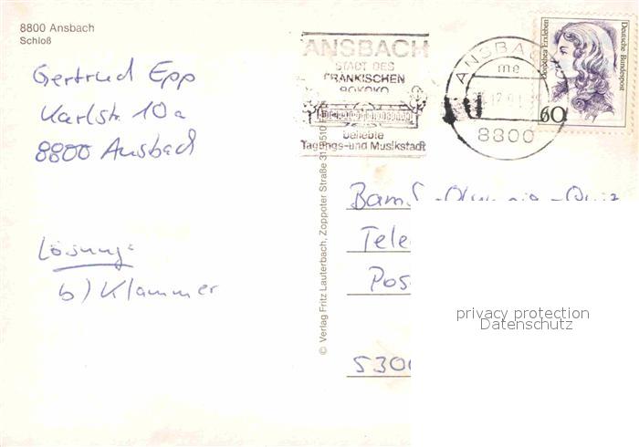 72711801 alte Postkarte Ansbach Mittelfranken Schloss postalisch gelaufen Erhaltung siehe scans [LiesaD40] KatCode: 11110009561000