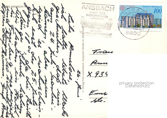 73228358 alte Postkarte Ansbach Mittelfranken Schloss Eingang Markgraf Georg Brunnen Hofgarten Fontaene Orangerie Herrieder Tor Alter Hof postalisch gelaufen Erhaltung siehe scans [FriedD77] KatCode: 11110009561000