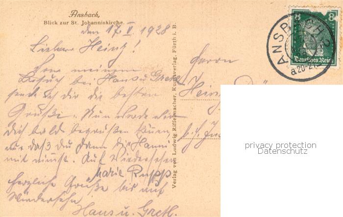 73777273 alte Postkarte Ansbach Mittelfranken Stadtbild mit Kirche postalisch gelaufen Erhaltung siehe scans [FriedD77] KatCode: 11110009561000