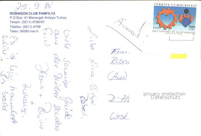 old postcard Antalya Fliegeraufnahme Robinson Club Pamfilya postalisch gelaufen Erhaltung siehe scans