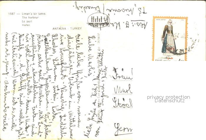 old postcard Antalya Hafen Segelboot Boot Teilansicht postalisch gelaufen Erhaltung siehe scans