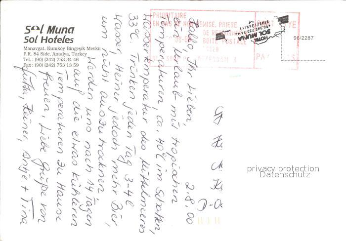 old postcard Antalya Sol Muna Hotel Strand Palmen postalisch gelaufen Erhaltung siehe scans
