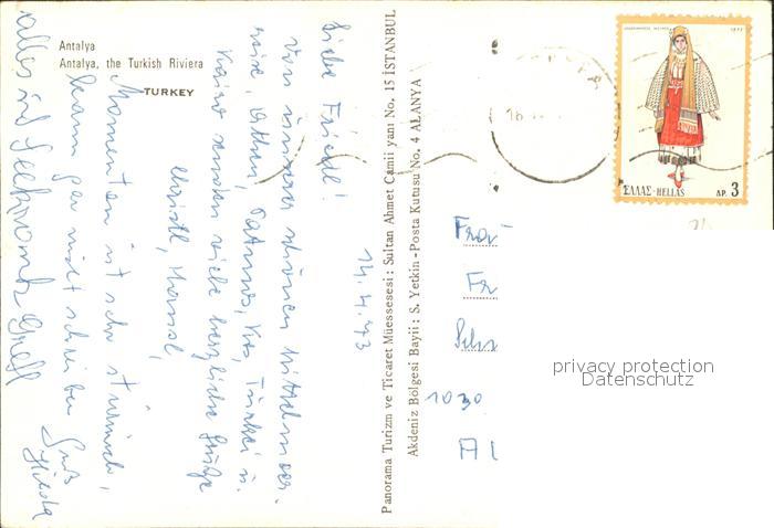 old postcard Antalya Theater Wasserfall Moschee Segelboot postalisch gelaufen Erhaltung siehe scans