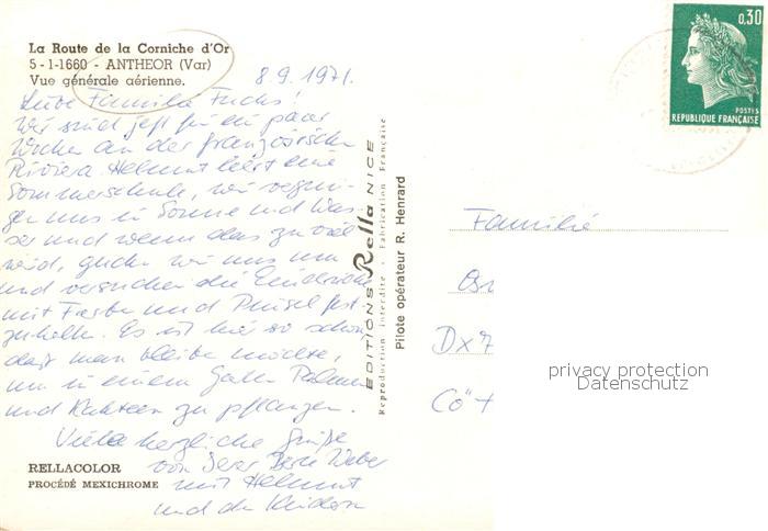 13786995 Antheor 83 Var Route de la Corniche d Or vue aérienne postalisch gelaufen Fliegeraufnahme Erhaltung siehe scans [FriedD77] Fliegeraufnahme carte postale Frie Katcode 11170083183118