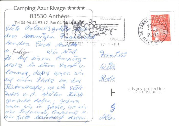 12003078 carte postale Antheor Camping Azur Rivage postalisch gelaufen Erhaltung siehe scans KatCode: 11170083183118