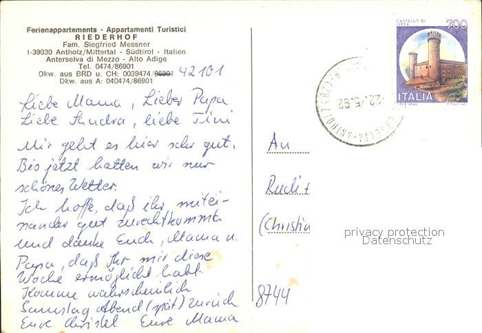 72233252 alte Postkarte Antholz Mitterthal Riederhof Antholz Pension postalisch gelaufen Erhaltung siehe scans KatCode: 11390