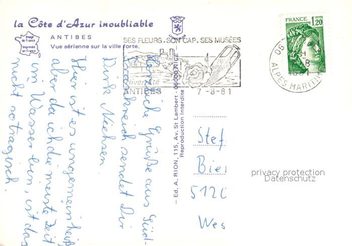13232198 carte postale Antibes Alpes Maritimes Fliegeraufnahme postalisch gelaufen Erhaltung siehe scans [NatalD47] KatCode: 11170006106004