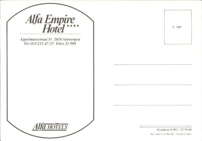 71475601 Antwerpen Anvers Alfa Empire Hotel postalisch nicht gelaufen Erhaltung siehe scans KatCode: 11070011000017