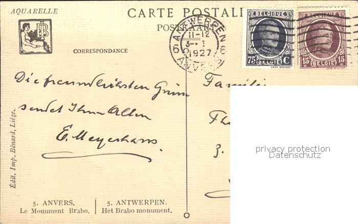 11718161 carte postale Anvers Antwerpen Monument Brabo Aquarelle Kuenstlerkarte postalisch gelaufen Erhaltung siehe scans KatCode: 11070011000017