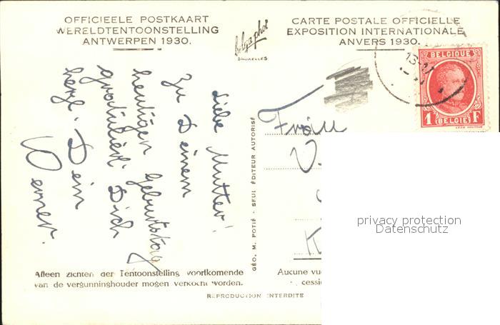 42565897 carte postale Anvers Antwerpen Vieille Belgique Exposition Internationale 1930 Carte postale officielle postalisch gelaufen Erhaltung siehe scans [FriedD77] KatCode: 11070011000017