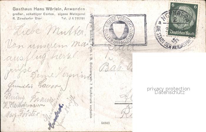 32211113 alte Postkarte Anwanden Gasthaus Hans Woerlein Stadt NZ3 postalisch gelaufen Erhaltung siehe scans KatCode: 11110009573134