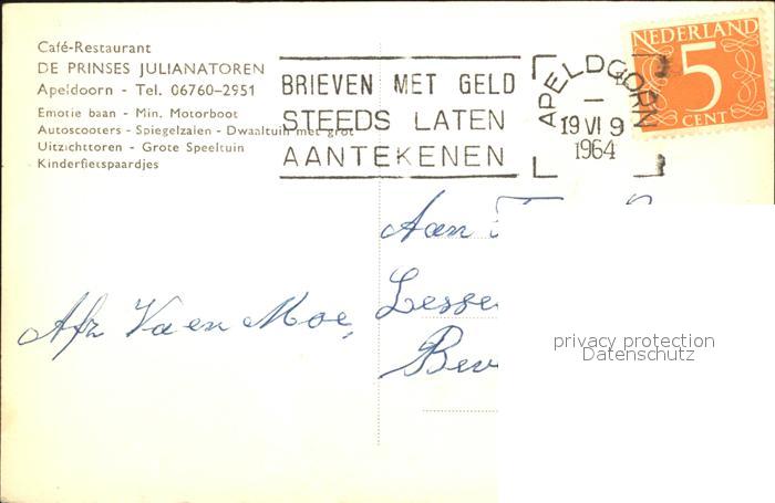 alte Postkarte Apeldoorn Cafe Restaurant De Prinses Julianatoren postalisch gelaufen Erhaltung siehe scans