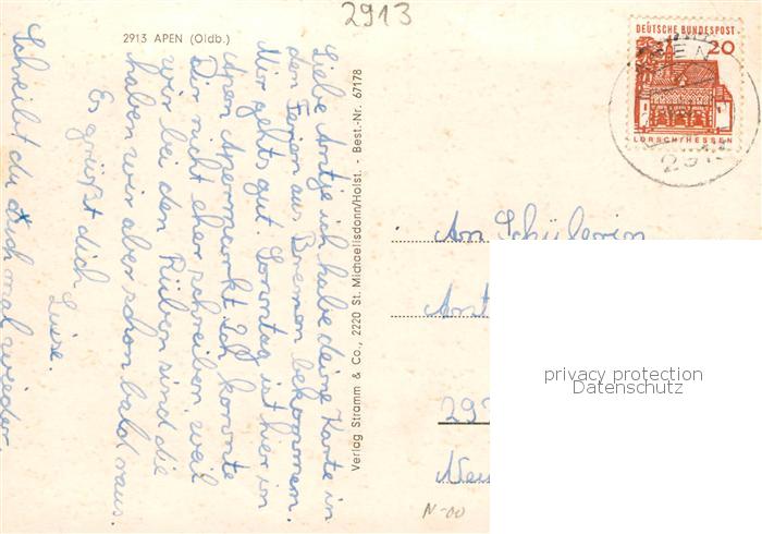 73870815 alte Postkarte Apen Ammerland Niedersachsen Fluss Schule Stadttor postalisch gelaufen Erhaltung siehe scans [WerneD78] KatCode: 11110003451001