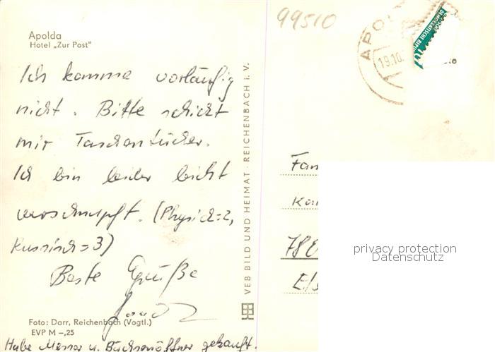 73853684 alte Postkarte Apolda Hotel Zur Post postalisch gelaufen Erhaltung siehe scans [WerneD78] KatCode: 11110016071001