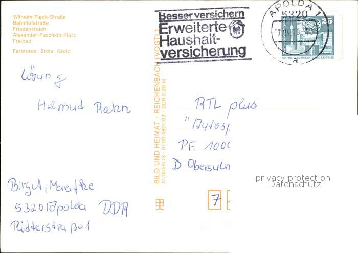 72413603 alte Postkarte Apolda Wilhelm Pieck Strasse Bahnhofstrasse Alexander Puschkin Platz Freibad postalisch gelaufen Erhaltung siehe scans KatCode: 11110016071001