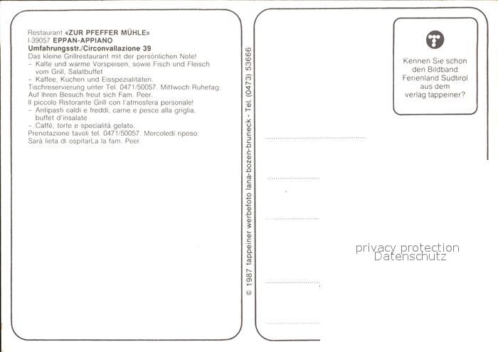 Appiano Restaurant zur Pfeffermuehle postalisch nicht gelaufen Erhaltung siehe scans