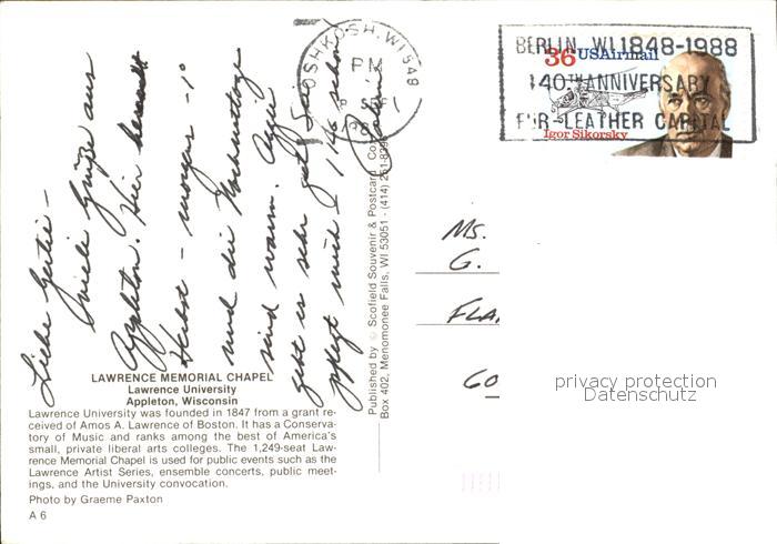 72444575 old postcard Appleton Wisconsin Lawrence Memorial Chapel postalisch gelaufen Erhaltung siehe scans KatCode: 14140520000000