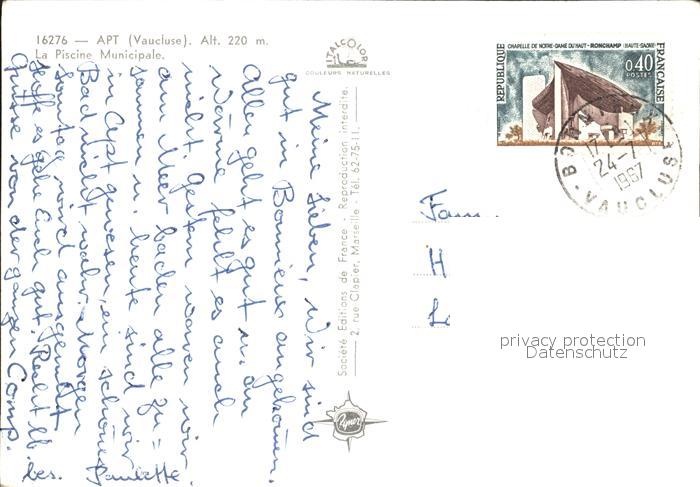 12352404 carte postale Apt Piscine Municipale postalisch gelaufen Erhaltung siehe scans KatCode: 11170084184003