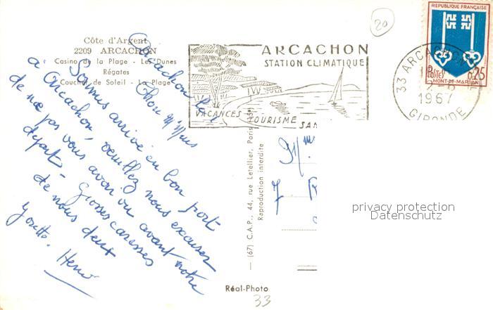 13504487 carte postale Arcachon Gironde Casino de la Plage Les Dunes Regates Coucher de Soleil La Plage postalisch gelaufen Erhaltung siehe scans [WerneD78] KatCode: 11170033633009