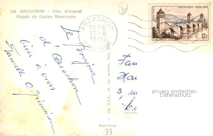 13504488 carte postale Arcachon Gironde Facade du Casino Mauresque postalisch gelaufen Erhaltung siehe scans [WerneD78] KatCode: 11170033633009