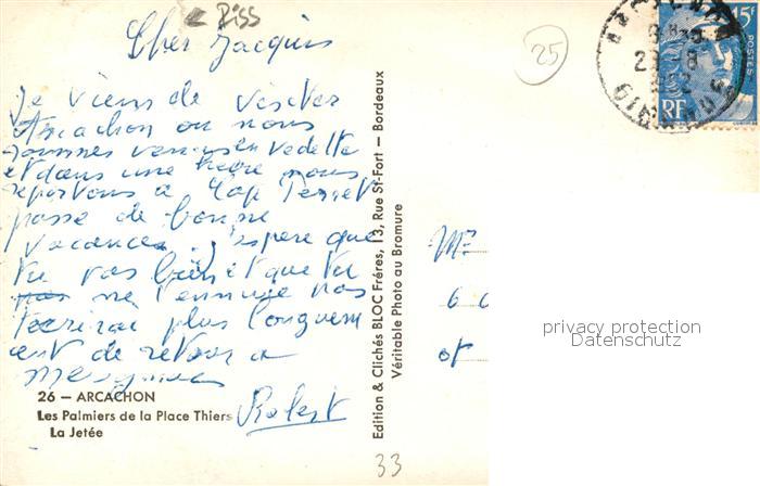 13504430 carte postale Arcachon Gironde Les Palmiers de la Place Thiers La Jetee postalisch gelaufen Erhaltung siehe scans [WerneD78] KatCode: 11170033633009