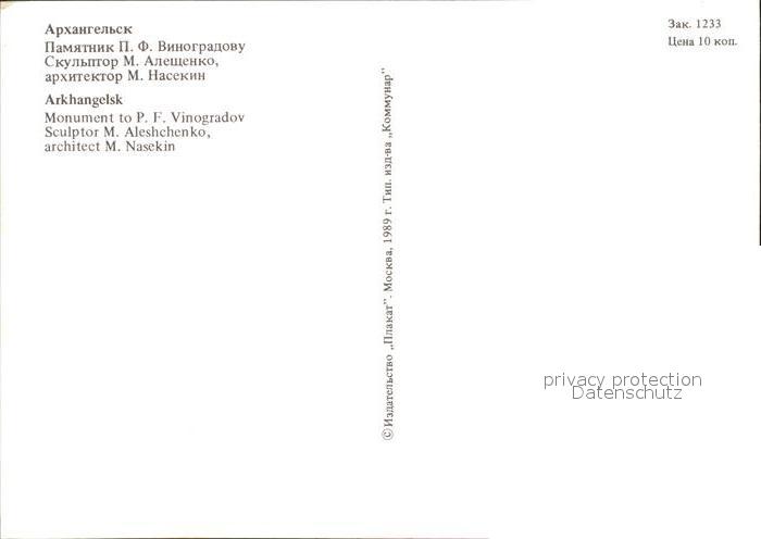 Archangelsk Monument to P F Vinogradov postalisch nicht gelaufen Erhaltung siehe scans
