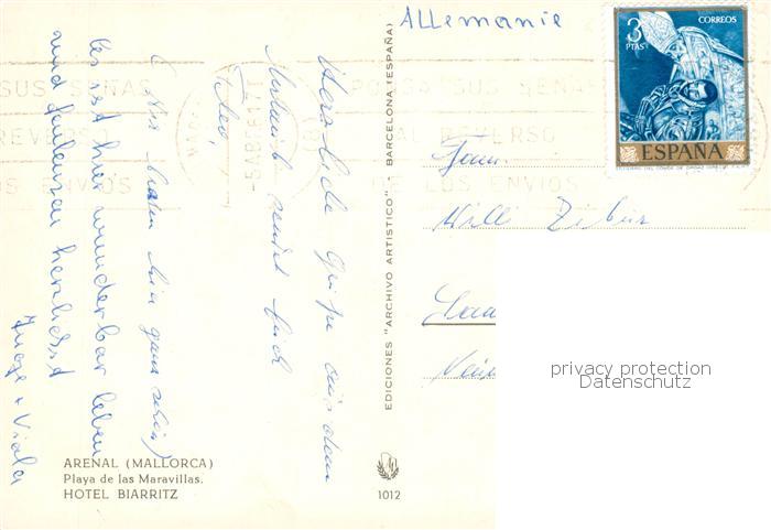 73852334 Arenal Mallorca ES Hotel Biarritz Playa de la Maravillas postalisch gelaufen Erhaltung siehe scans [FriedD77] old postcard Frie Katcode 11510