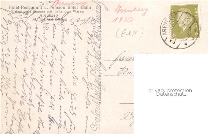 73802136 alte Postkarte Arenberg Koblenz Hotel Restaurant Pension Roter Hahn postalisch gelaufen Erhaltung siehe scans [FriedD77] KatCode: 11110007111000