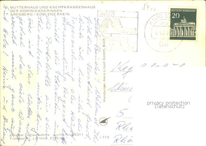 72356800 alte Postkarte Arenberg Koblenz Mutterhaus Kneippkrankenhaus der Domikanerinnen Fliegeraufnahme postalisch gelaufen Erhaltung siehe scans KatCode: 11110007111000