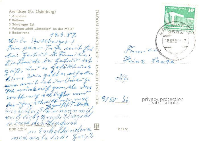 73549833 alte Postkarte Arendsee Altmark Rathaus Schramper Eck Fahrgastschiff Seeadler an der Mole Badestrand postalisch gelaufen Erhaltung siehe scans [WerneD78] KatCode: 11110015081030