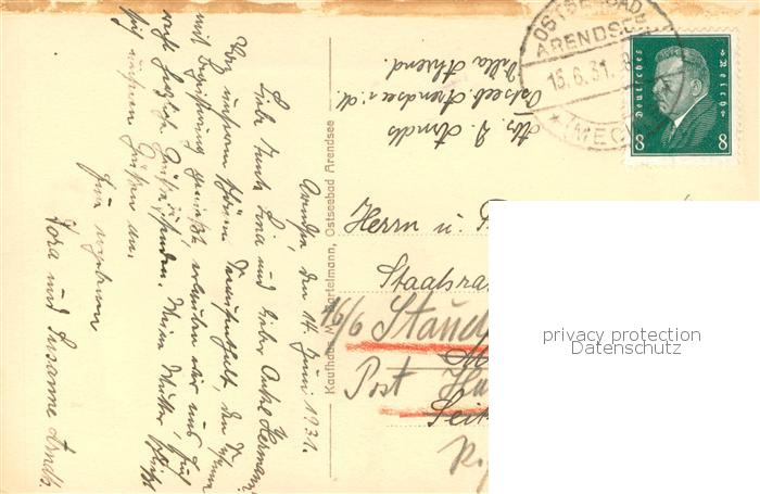 73776504 alte Postkarte Arendsee Ostsee Strandpromenade Ostseebad postalisch gelaufen Erhaltung siehe scans [FriedD77] KatCode: 11110013051042