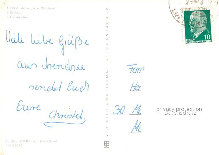 72953559 alte Postkarte Arendsee Ostseebad FDGB Erholungsheim Waldheim Rathaus Arendseepartie postalisch gelaufen Erhaltung siehe scans [WerneD78] KatCode: 11110013051042