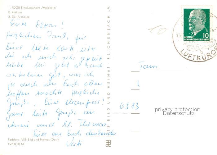 73015281 alte Postkarte Arendsee Ostseebad FDGB Erholungsheim Waldheim Rathaus Arendseepartie postalisch gelaufen Erhaltung siehe scans [WerneD78] KatCode: 11110013051042