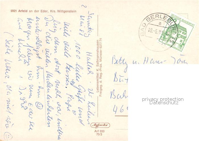 73634557 alte Postkarte Arfeld an der Eder Fliegeraufnahme postalisch gelaufen Erhaltung siehe scans [WerneD78] KatCode: 11110005970004