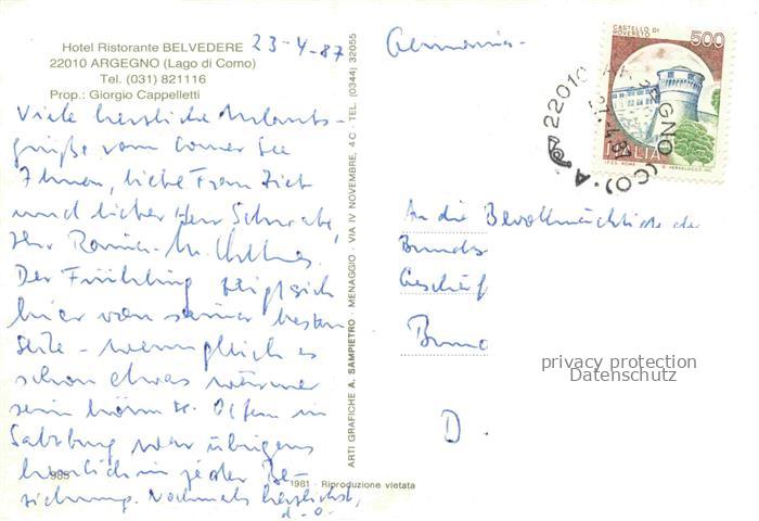 74156430 old postcard Argegno COMO Lago di Como Lombardia IT Albergo-Belvedere Lago-di-Como Hotel Seepromenade Berge Uferpromenade See Terrasse postalisch gelaufen Erhaltung siehe scans [Karloger] KatCode: 11240