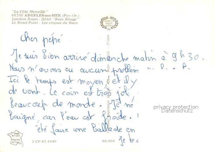 13535657 Argeles-sur-Mer Lauriers Roses Hôtel Beau Rivage Rond Point Criques du raco postalisch nicht gelaufen Erhaltung siehe scans [FriedD77] KatCode: 11170066166008