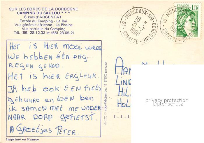 13518988 carte postale Argentat Camping du Saulou Collection Sur les Bords de la Dordogne postalisch gelaufen Erhaltung siehe scans [FriedD77] KatCode: 11170019219010