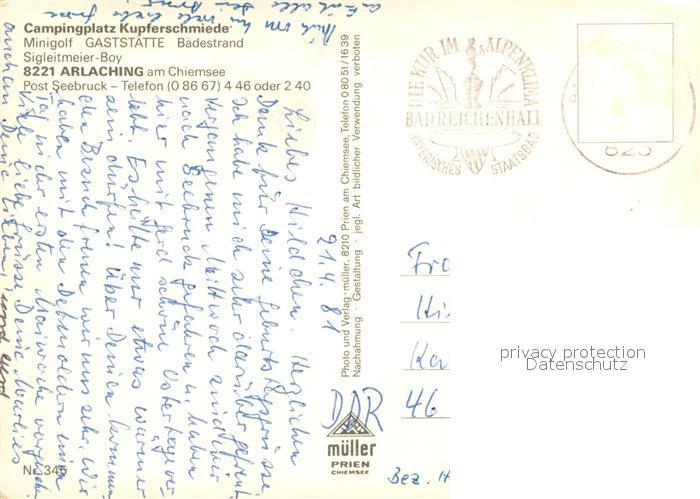 73686707 alte Postkarte Arlaching Campingplatz Kupferschmiede Badestrand Maibaum Kirche Gasthof Windsurfen postalisch gelaufen Erhaltung siehe scans [FriedD77] KatCode: 11110009189114
