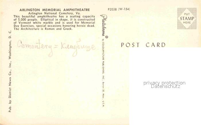 72767024 Arlington Virginia Memorial Amphitheatre postalisch nicht gelaufen Erhaltung siehe scans [LiesaD40] KatCode: 14140490000000