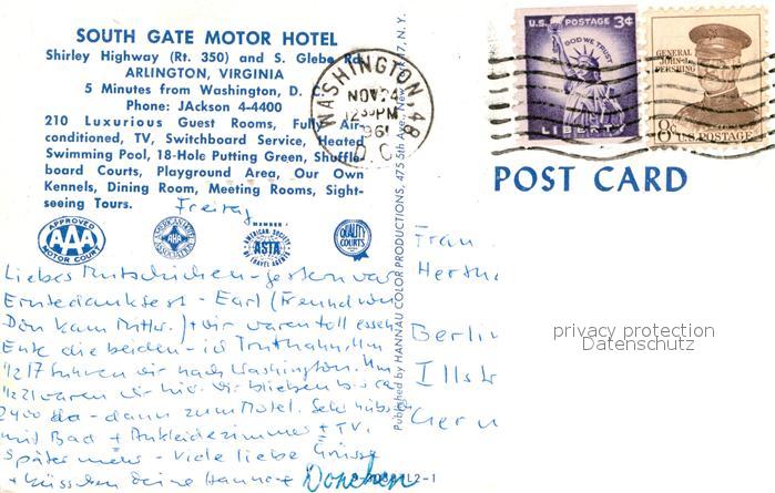 73003064 old postcard Arlington Virginia South Gate Motor Hotel postalisch gelaufen Erhaltung siehe scans [WerneD78] KatCode: 14140490000000