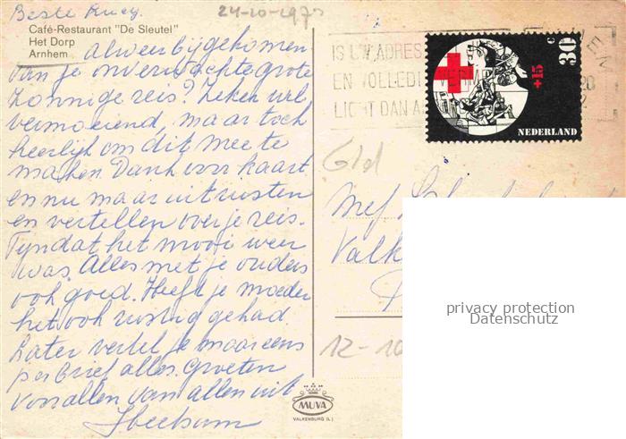 74156370 old postcard ARNHEM Arnheim NL De-Sleutel Café-Restaurant Het-Dorp Terrasse Rollstuhlfahrer Stadtpanorama Kirchtuerme Schornsteine postalisch gelaufen Erhaltung siehe scans [Karloger] KatCode: 11370400