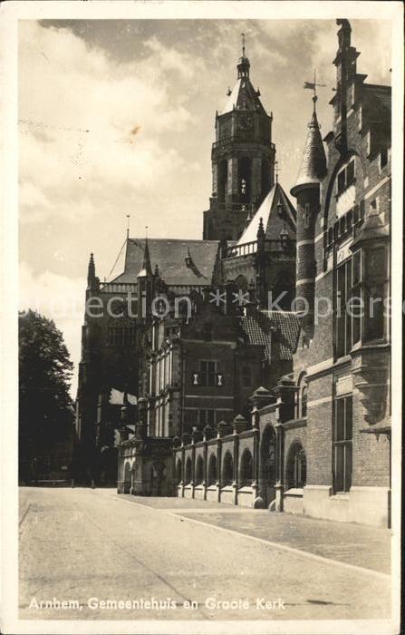 old postcard Arnhem Gemeentehuis en Groote Kerk postalisch gelaufen Erhaltung siehe scans