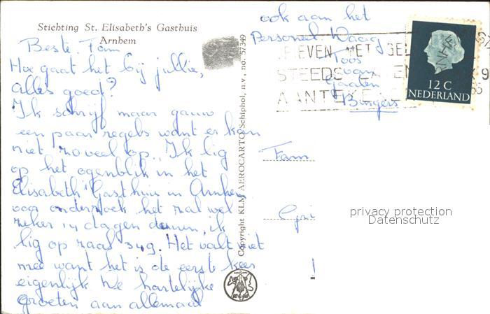 alte Postkarte Arnhem Stichting St Elisabeths Gasthuis Fliegeraufnahme postalisch gelaufen Erhaltung siehe scans