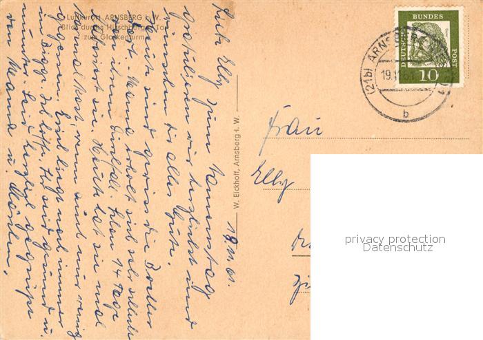 73310121 alte Postkarte Arnsberg Westfalen Blick durchs Hirschberger Tor zum Glockenturm postalisch gelaufen Erhaltung siehe scans [FriedD77] KatCode: 11110005958004
